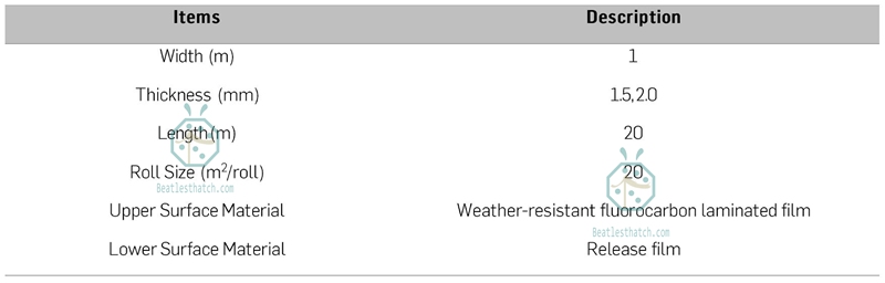 この製品は耐候性に優れた自己粘着性アスファルト防水膜であり、 熱帯地方の茅葺き屋根 施工方法:本製品は、耐候性フッ素樹脂ラミネートフィルムで覆われた高粘着性ゴムアスファルト接着剤で構成されています。ゴムアスファルト表面の裏面には剥離ライナーが貼られています。この製品は、長期間露出するクールルーフの防水用途に特に適しています。
