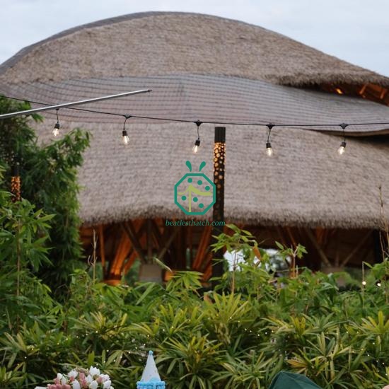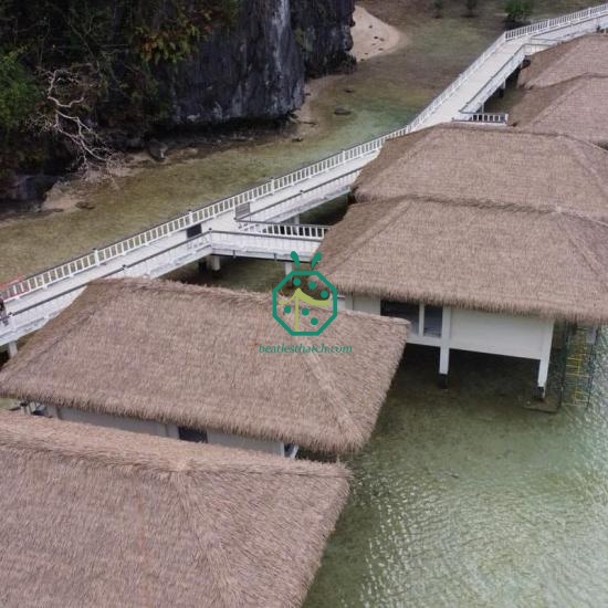 水上バンガローの茅葺き屋根の装飾には、 ナイロン茅葺き屋根瓦 非常に費用対効果の高いソリューションです。ナイロンサッチタイルは、その化学構造により、ビーチエリアへの設置に非常に耐久性があります。ナイロン製のバンガローサッチ屋根はふわふわとした外観で、リゾートホテルへのお客様の関心を大いに引き付けます。同時に、ナイロンサッチパネルはUL 94-2013耐火試験規格のほとんどの指標でV0グレードに達しているため、天然のサッチ屋根材と比較して安全性も優れています。上記のナイロンサッチ屋根の利点を考慮すると、リゾートホテルのバンガローサッチ屋根デザインへの適用において費用対効果が高いと言えます。